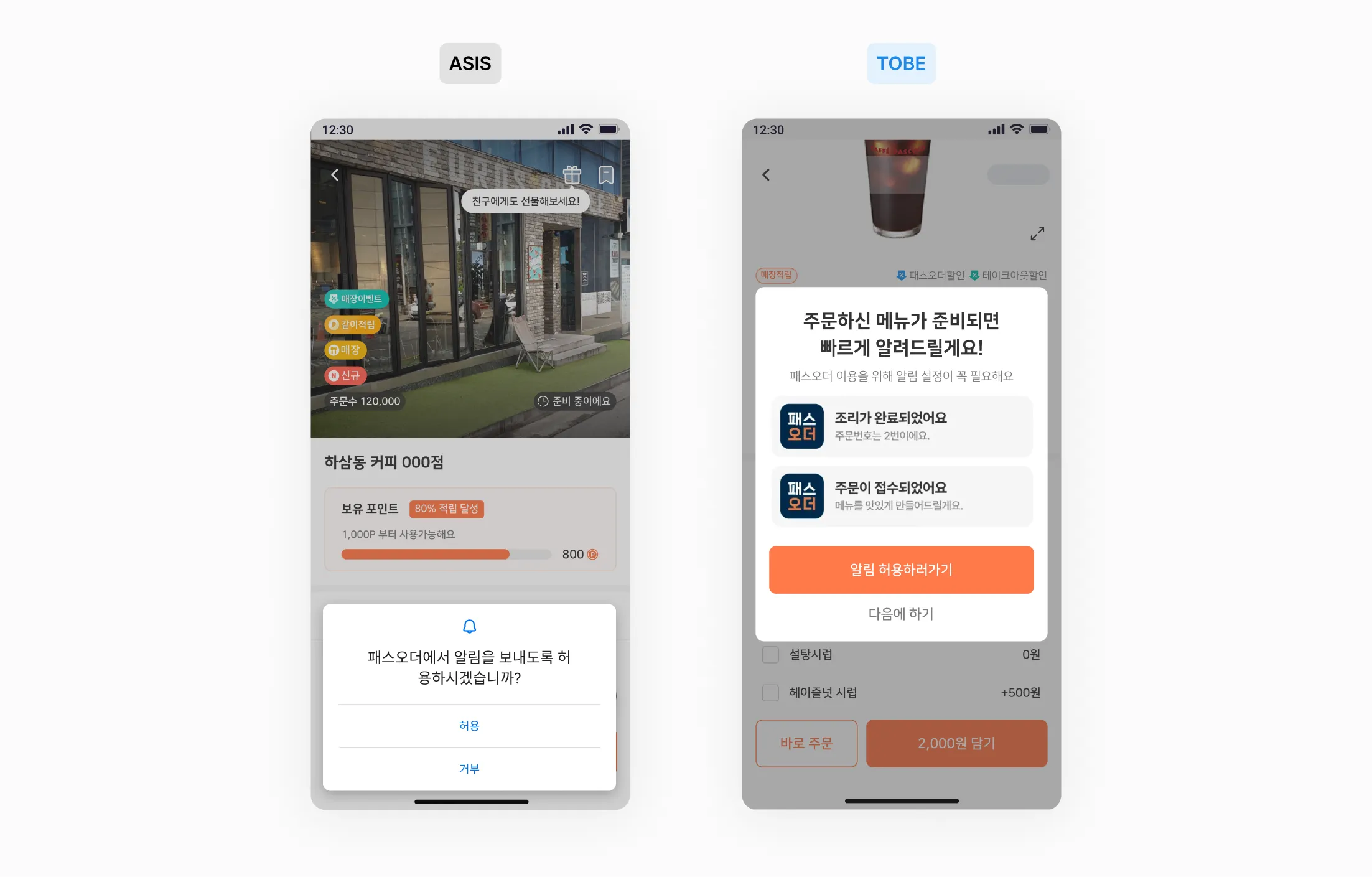 이에 따라 메뉴판 진입 시 노출되던 다이얼로그를 사용자가 결제를 결심하는 순간인 장바구니 진입 시점으로 변경했습니다. 또한 기존 시스템 다이얼로그 대신 커스텀 다이얼로그를 적용해 권한 요청의 필요성을 이해하기 쉬운 UX라이팅을 제공했습니다.