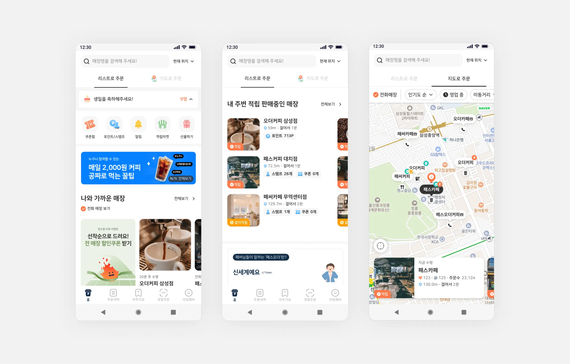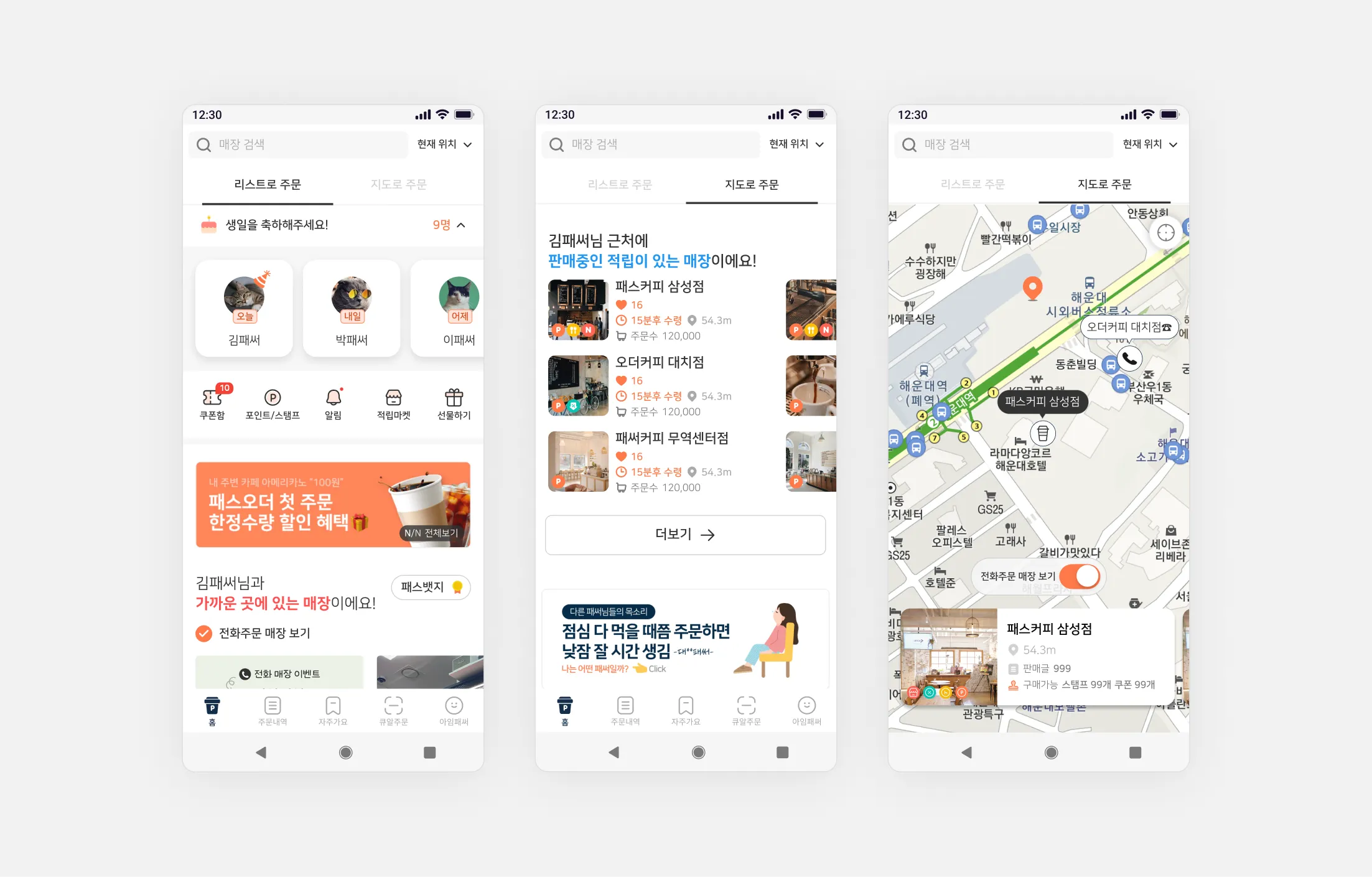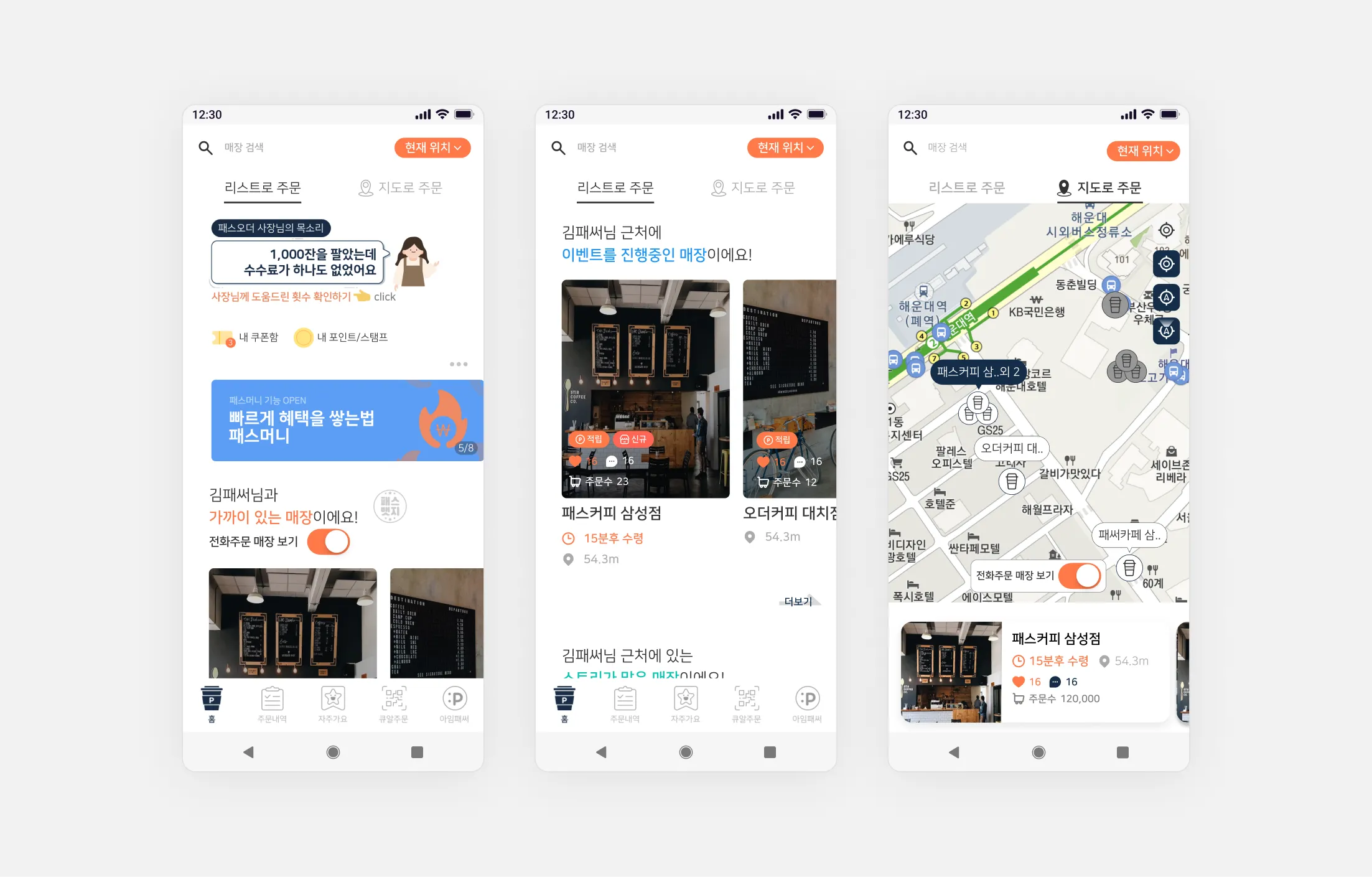 저희가 생각하는 좋은 UX는 잘 만들어진 원칙만 지키는 게 아니라 실제 사용자의 목소리를 듣고 그들이 원하는 것을 제공하는 것이라고 생각하는데요. 이 가치관을 기반으로 실제로 지난 1년간 패스오더에는 눈에 띄는 변화들이 있었습니다. 출시 이후 큰 변화가 없었던 메인 화면, 메뉴판, 장바구니 등 핵심 화면들이 실제 사용자의 의견을 바탕으로 개선해 나갔죠.