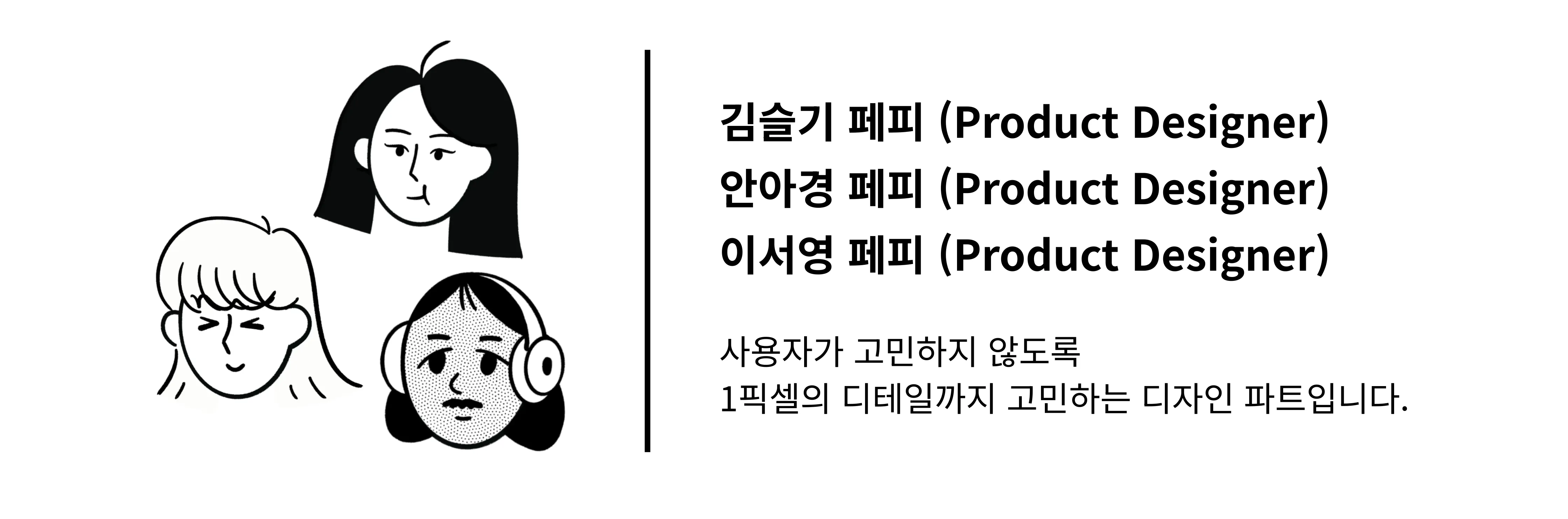 저희는 프로덕트 팀이라는 이름 아래 개발자, 프로덕트 매니저, 프로덕트 디자이너, 데브옵스 등 프로덕트에 관련된 직군이 함께 모여 있어요. 그 안에서 디자이너는 세 명이라 상대적으로 소규모 그룹입니다.😄