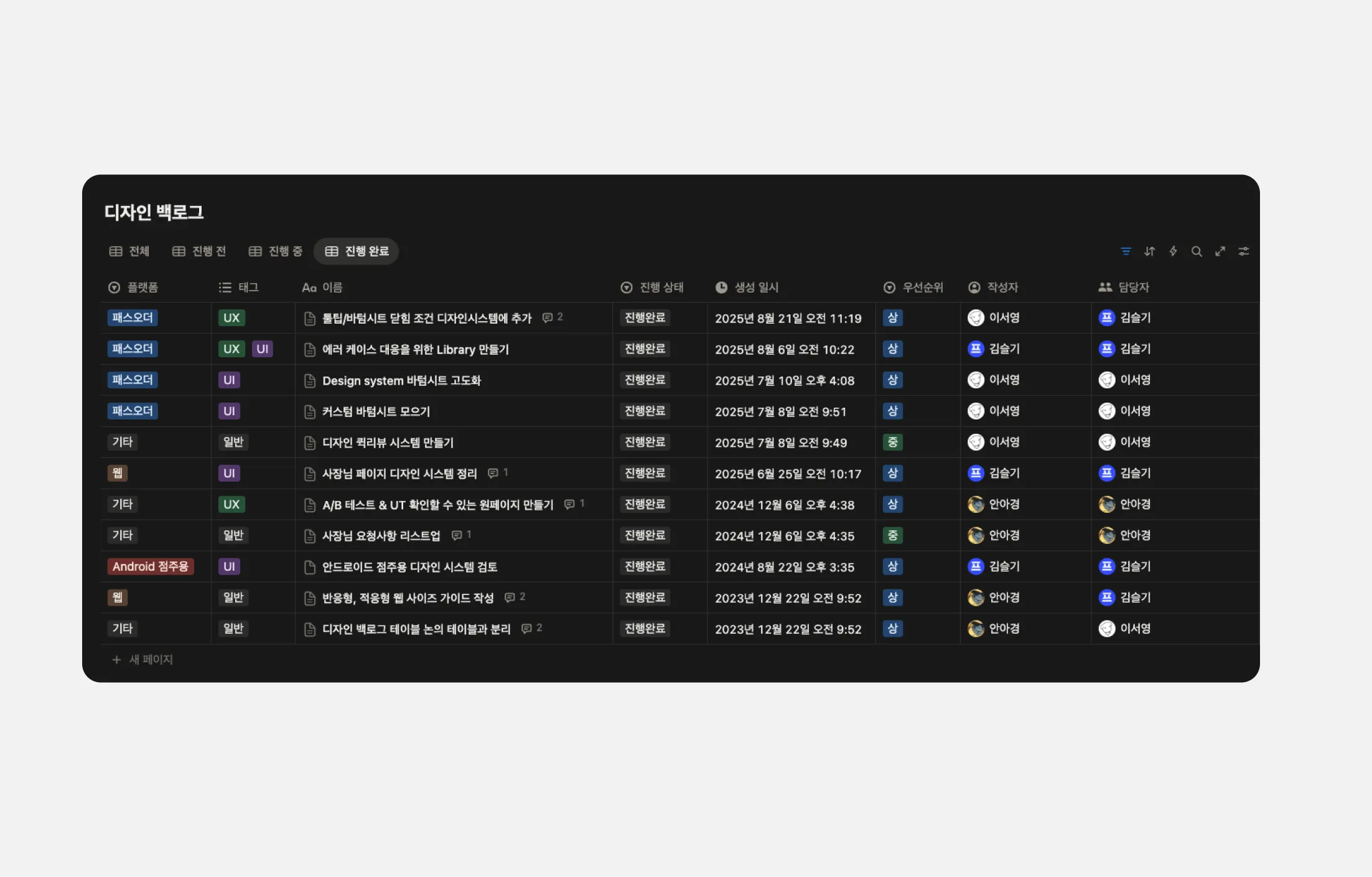 이런 문제들 때문에 프로덕트의 완성도와 사용성이 낮아지는 문제가 생겼어요. 이 부분을 개선하지 않으면 전체 프로덕트의 완성도에도 영향을 줄 수 있다는 것에 디자이너 모두가 공감했고, 그 결과 디자인 백로그가 만들어지게 되었습니다.