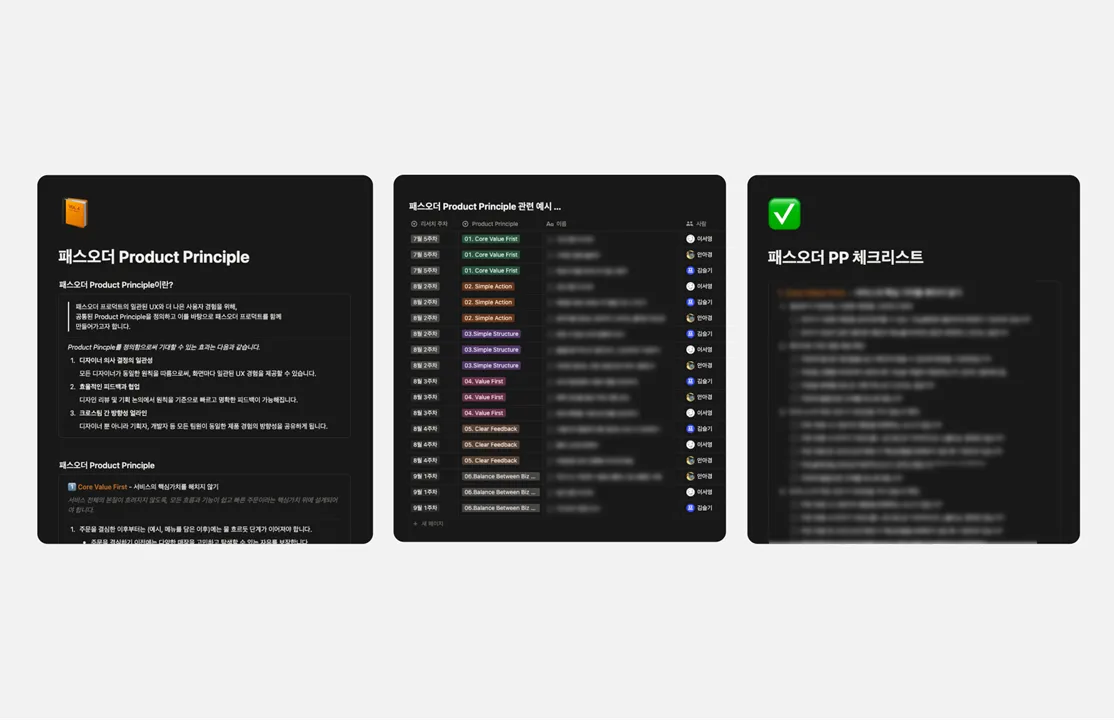 이렇게 각 디자이너가 고민했던 Why들을 하나의 가이드로 모으기 위해 최근 패스오더 원칙(Product Principle)을 정리하고 있어요.