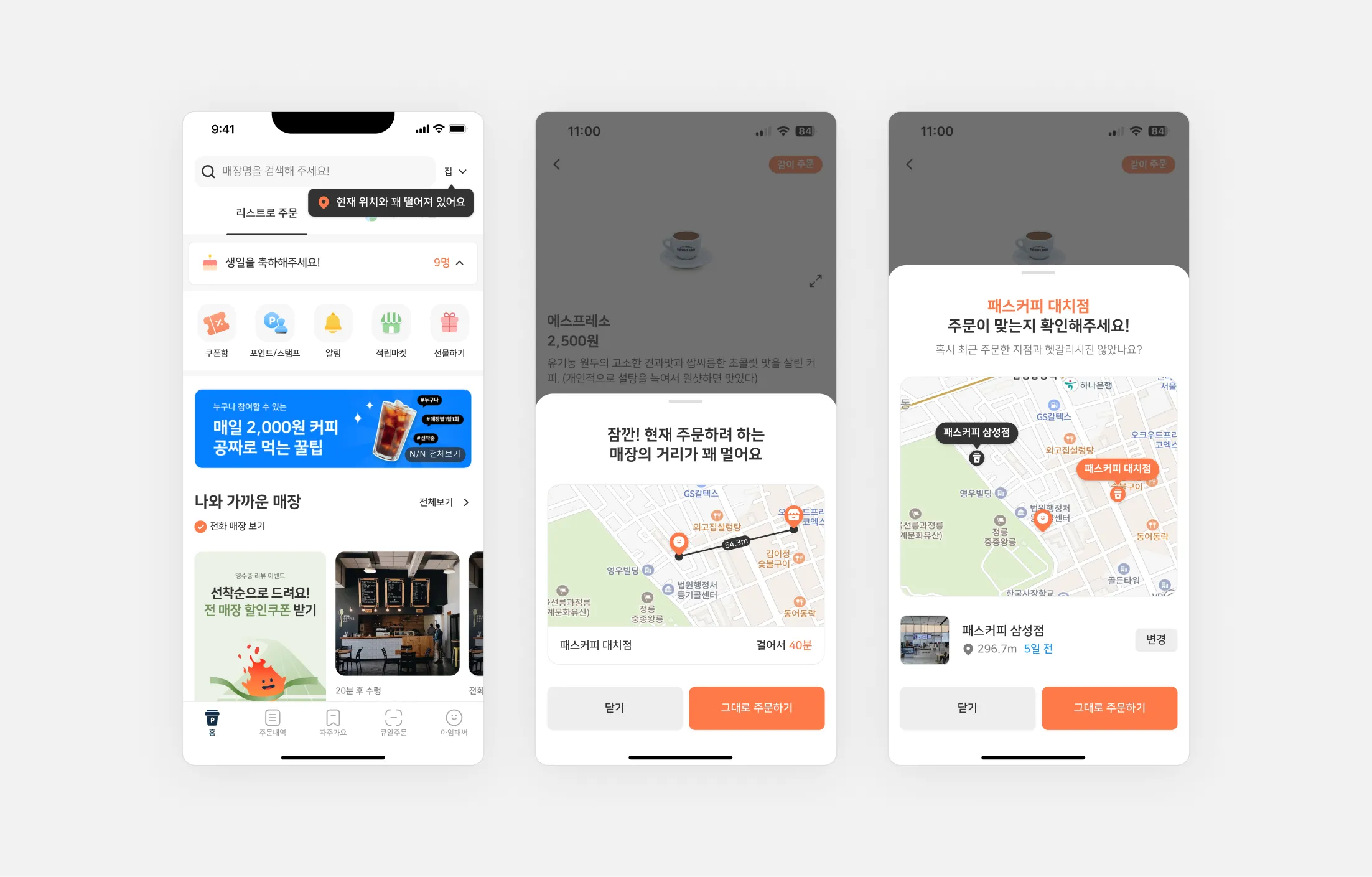 특히 기억에 남는 프로젝트 중 하나는 사용자들이 매장을 착각하지 않도록 주문 경험을 개선하고자 했던 ‘오주문 개선 프로젝트’예요. 사용자가 의도치 않게 잘못 주문하는 경우는 서비스에 부정적인 경험을 남길 수 있기에, 내부적으로 반드시 해결해야 한다는 공감대 속에서 이 프로젝트가 시작되었습니다. (아직 배포 준비중인 단계예요 🪜)