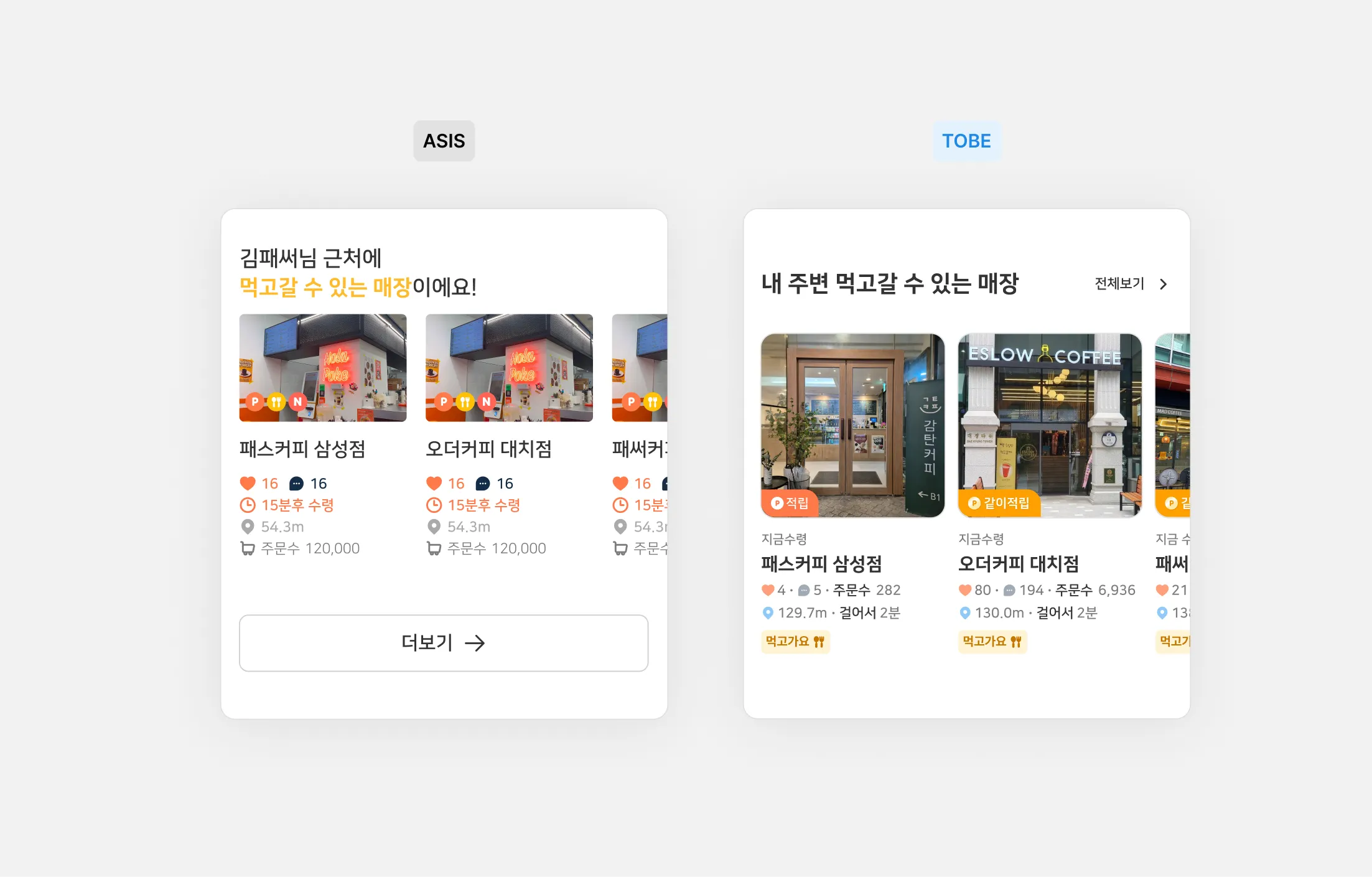 저는 매장 리스트 UI를 다듬어 메인 페이지 전체의 복잡도를 줄였던 경험을 말씀드리고 싶어요!
