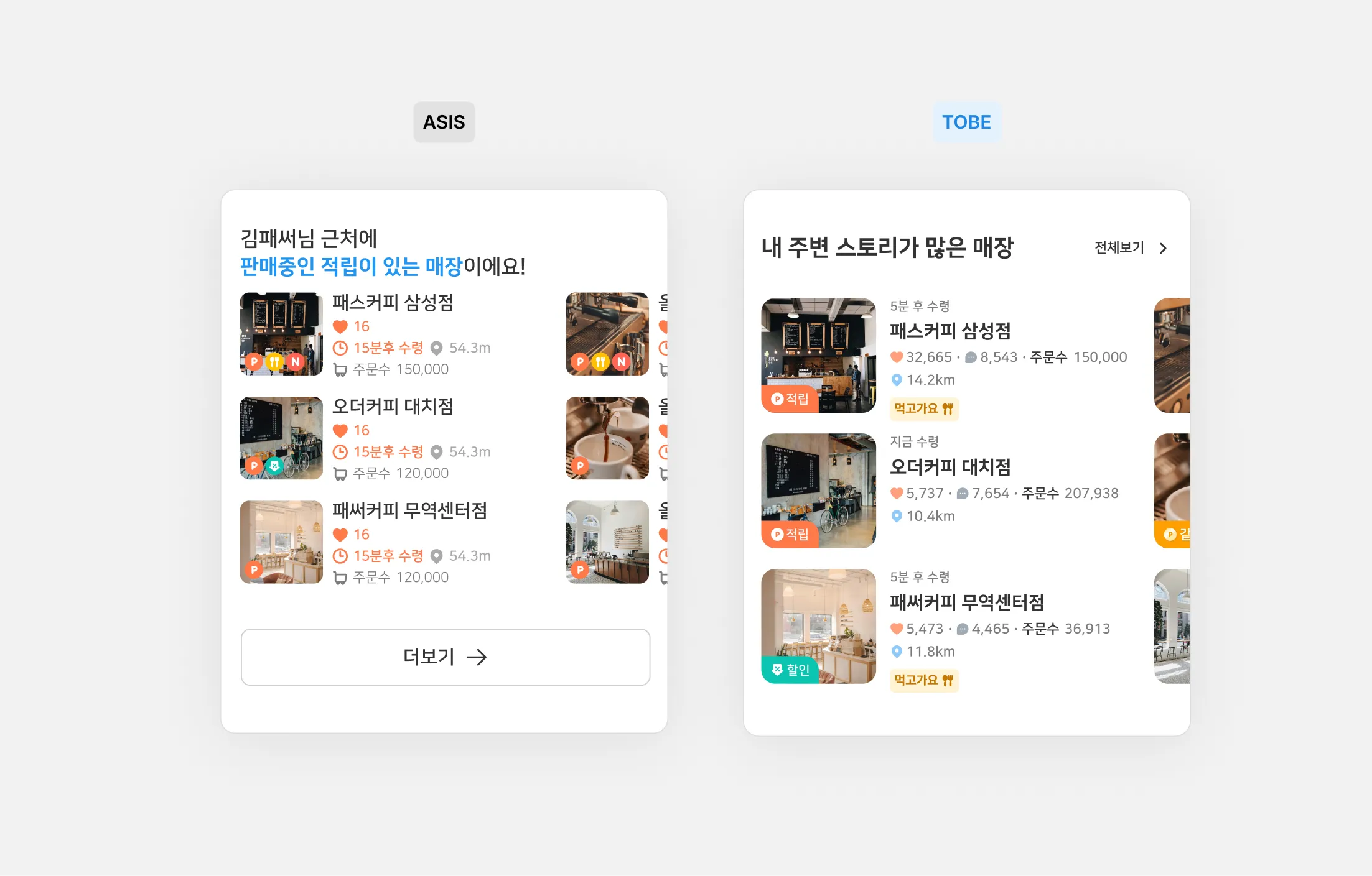 기존 메인 페이지는 가까운 매장, 적립 매장, 스토리가 많은 매장 등 여러 리스트가 한 화면에 모여 있었어요. 그러다 보니 화면 복잡도가 높게 느껴졌고 결과적으로 메인 페이지 전체가 다소 무겁다는 인상을 주었죠. 모든 정보를 한 번에 보여주다 보니, 정작 사용자가 필요한 정보를 파악하기가 어렵다는 문제도 있었습니다.