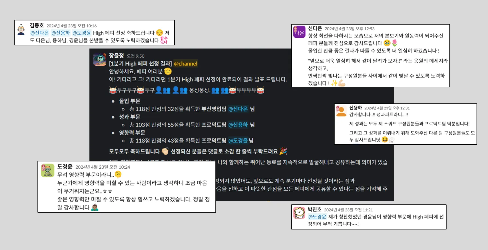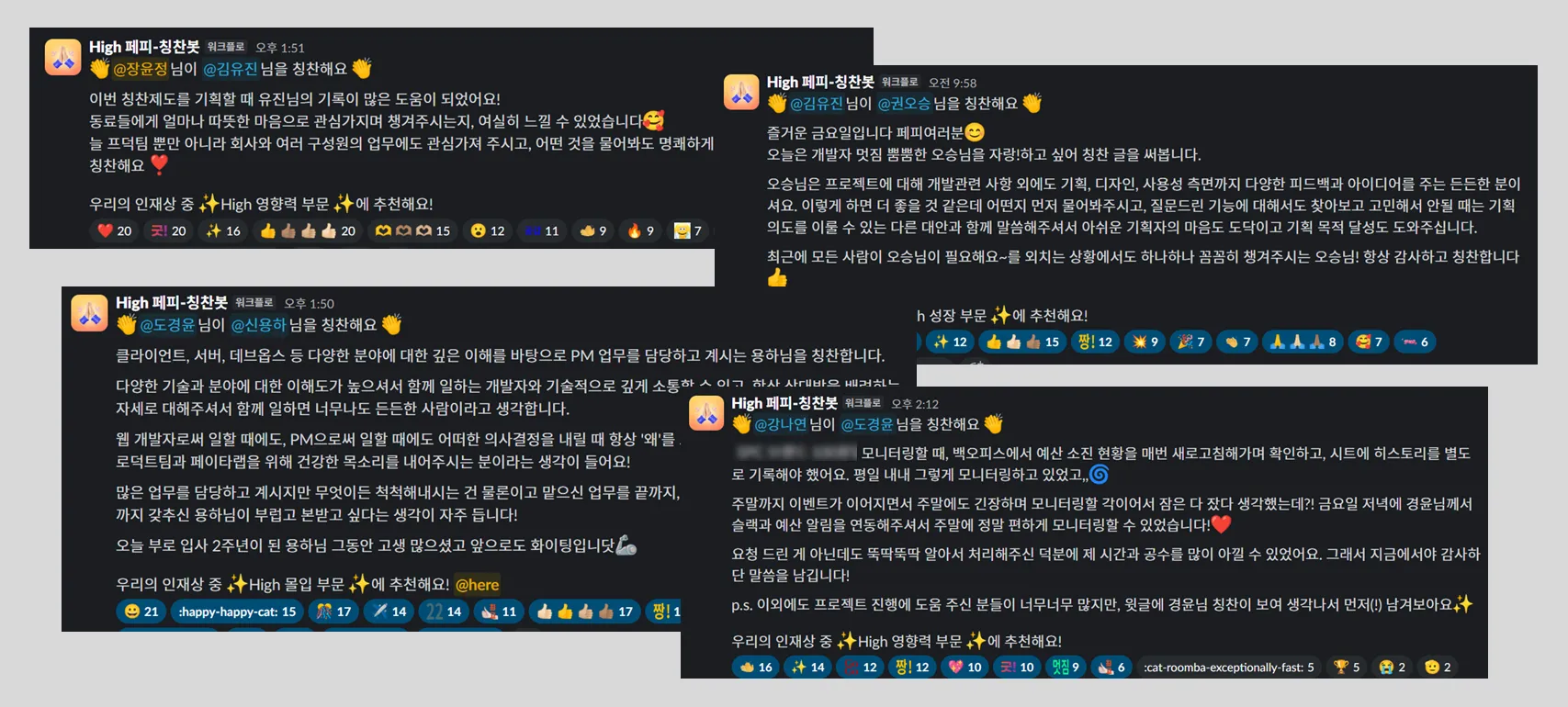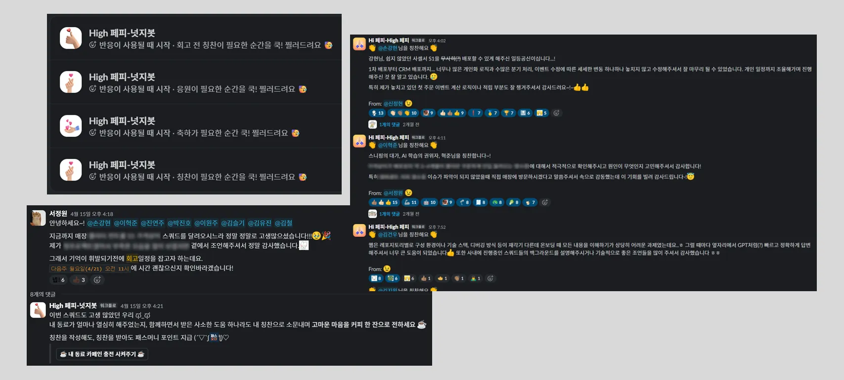 그렇게 첫 번째 High 페피가 선정되던 날, 슬랙 채널은 축하 메시지와 반짝이는 이모지로 활짝 피어났습니다. 🎉