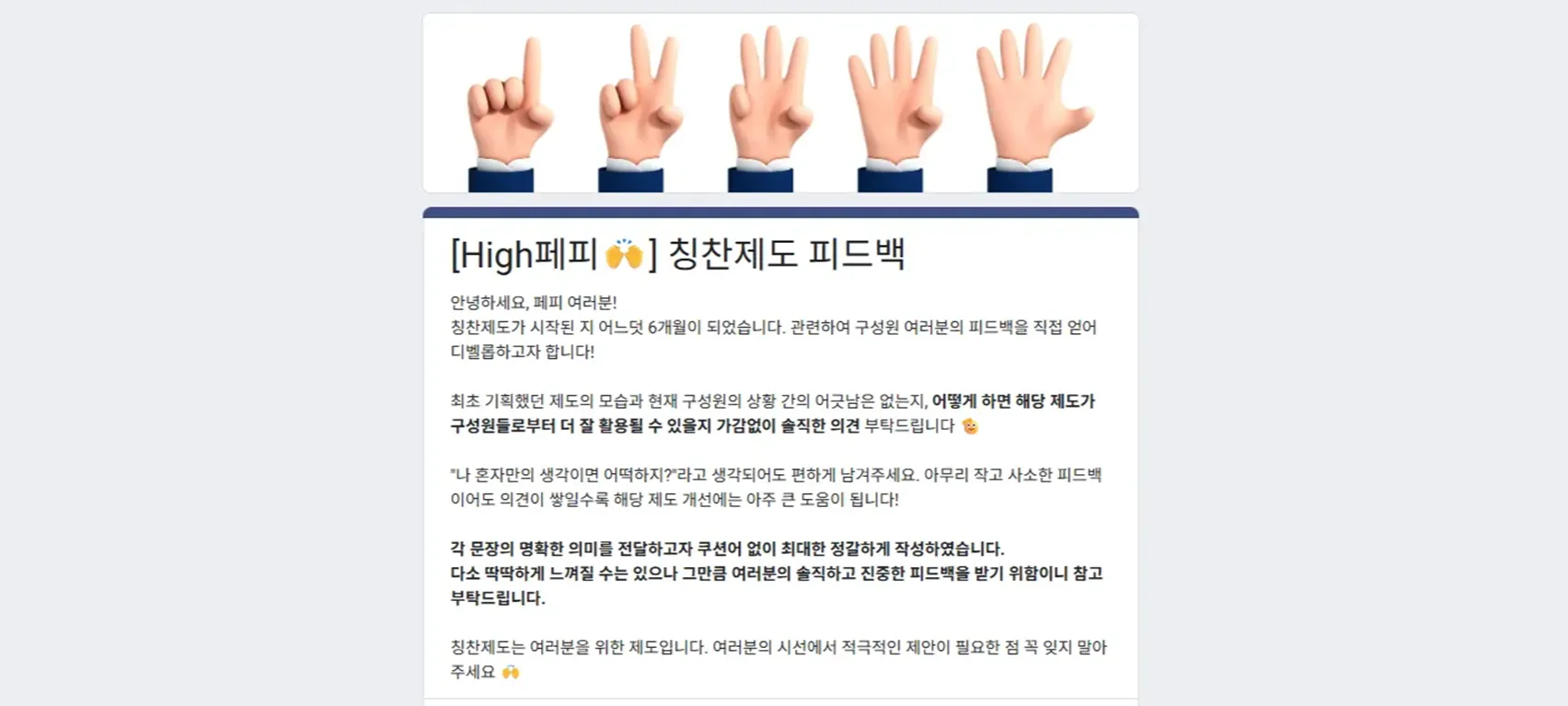이 칭찬 문화가 정말 잘 작동하고 있는지, 그 답은 오직 결국 구성원에게서만 찾을 수 있었기 때문이죠.