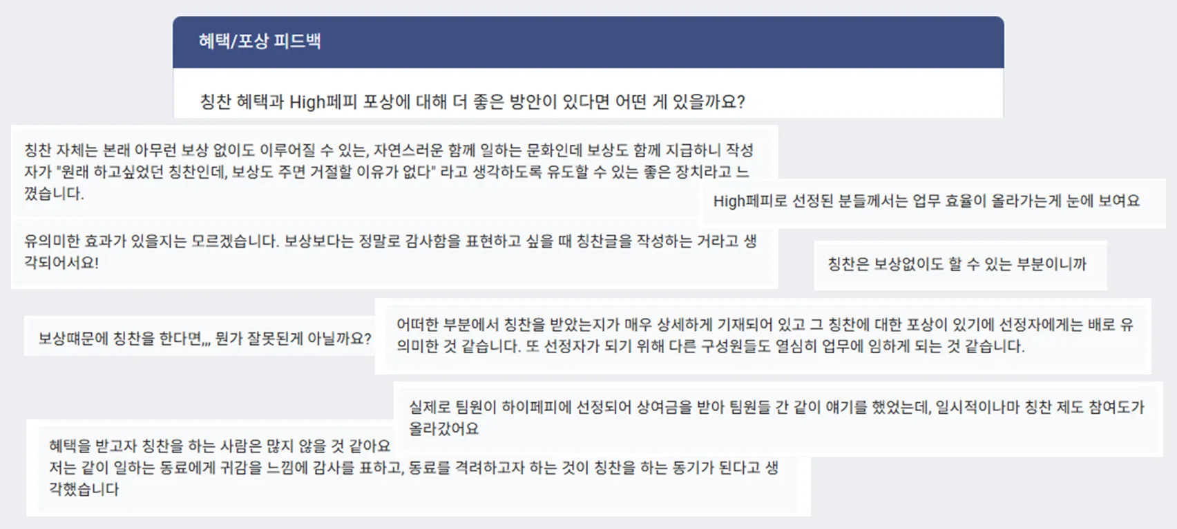 많은 구성원이 ‘“칭찬” 자체가 마음으로부터 나오는 거지 보상이 필요해서는 아니기 때문에 오히려 보상이 더 강화되어 칭찬을 하게 되는 모습을 바라지 않는다’ 고 하셨거든요. (감격🥹)
