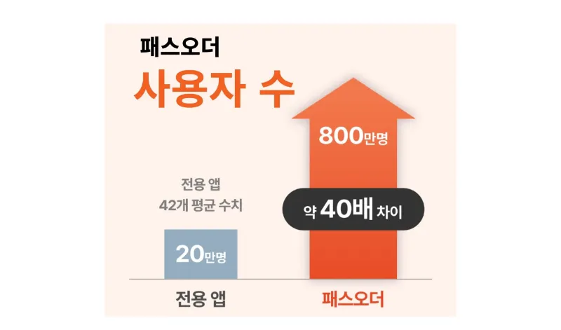자사 앱 평균 사용자 수 20만 명, 패스오더 앱 사용자 수는 800만 명으로 기록되었습니다. 무려 40배 이상 차이가 나죠. 그런데 더 놀라운 건 이 숫자가 과거형이라는 겁니다.