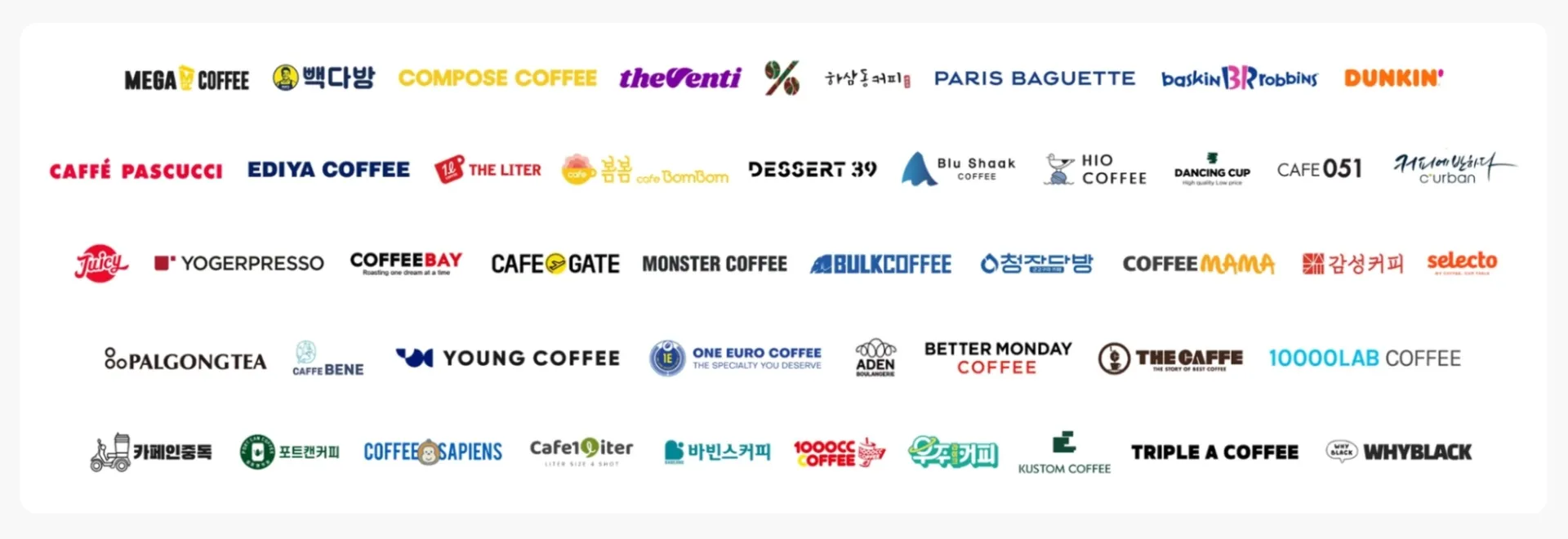 다양한 브랜드와의 제휴와 파트너십을 맺은 것도 도입 매장 수가 기하급수적으로 늘어나는 데 큰 힘이 되었어요. 우리 주변에서 흔히 볼 수 있는 친숙한 카페 브랜드인 메가커피, 컴포즈커피, 빽다방, 하삼동커피부터 모르는 사람이 없는 대기업 브랜드 파리바게뜨, 배스킨라빈스, 던킨, 파스쿠찌까지! 대한민국 대표 브랜드들이 줄줄이 페이타랩과 손을 잡고 있습니다.