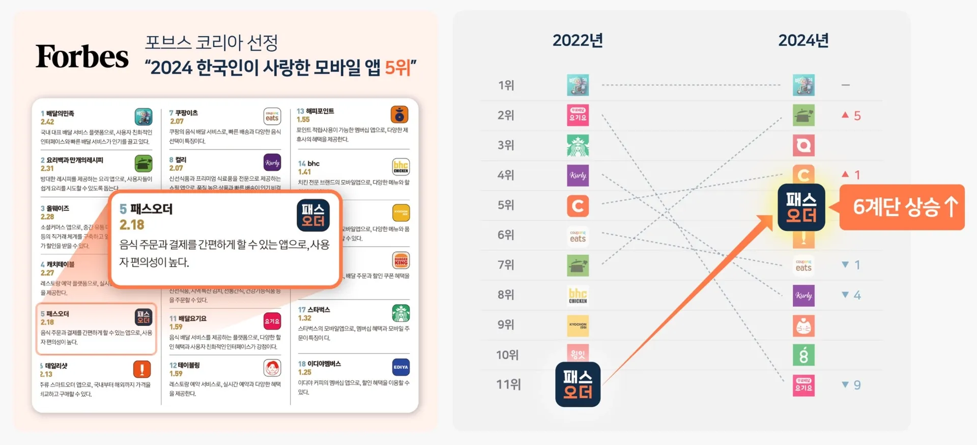 포브스 코리아에서 발표한 '2024 한국인이 사랑한 모바일앱' 순위에서 패스오더가 당당히 5위에 올라서게 되었습니다. 한국 사람들이 하루에도 몇 번씩 들여다보는 수많은 쟁쟁한 앱들을 제치고 '패스오더'가 당당히 Top 5에 올라선 것이죠.